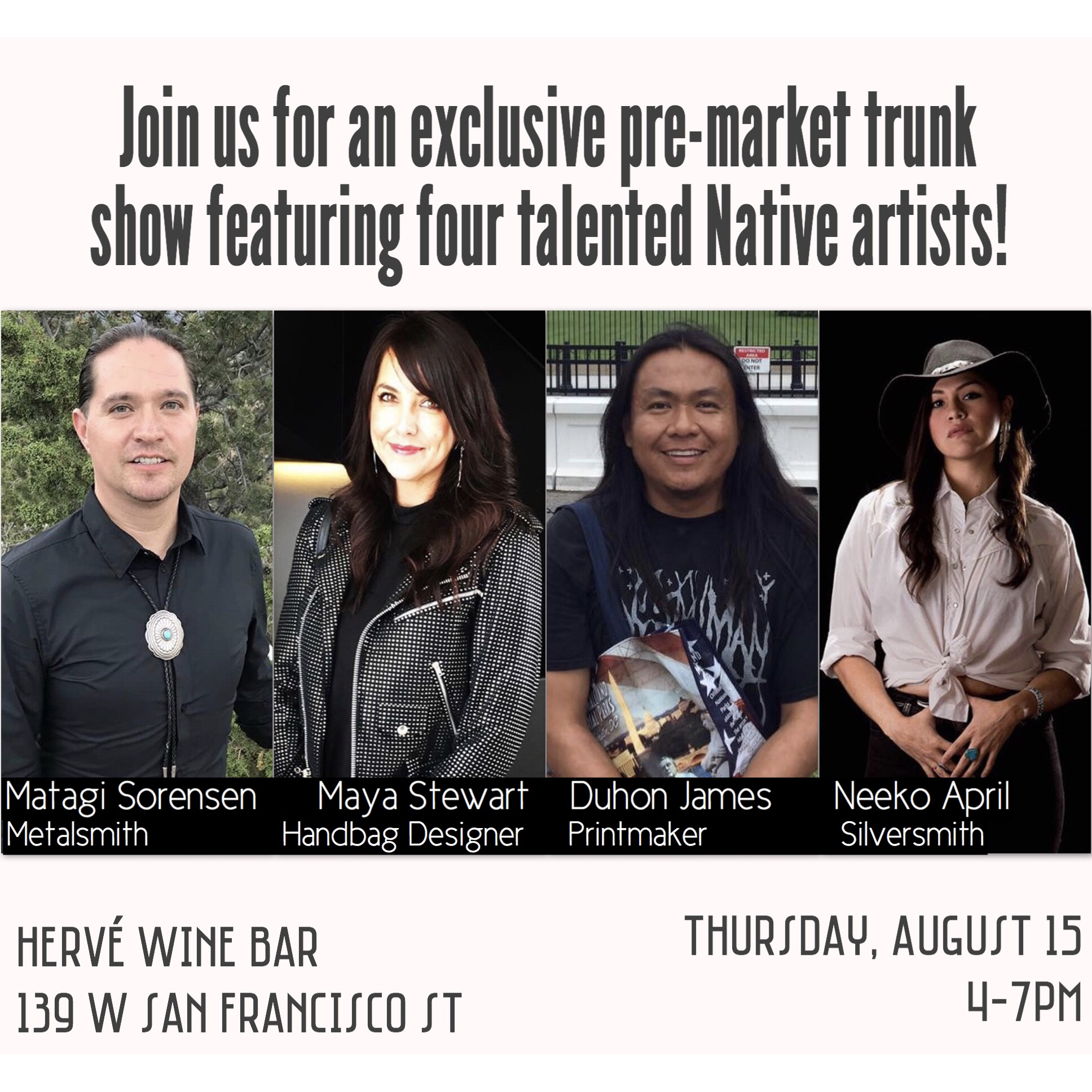 - Exclusive Pre-Market Trunk Show @ Hervé Wine Bar: Join us for an exclusive pre-Market show featuring 3 Native artists: metalsmith Matagi Sorensen (Yavapai-Apache), handbag & accessory designer Maya Stewart (Chickasaw, Creek and Choctaw), printmaker Duhon James (Diné), and silversmith Neeko April (Diné). 4-7pm.