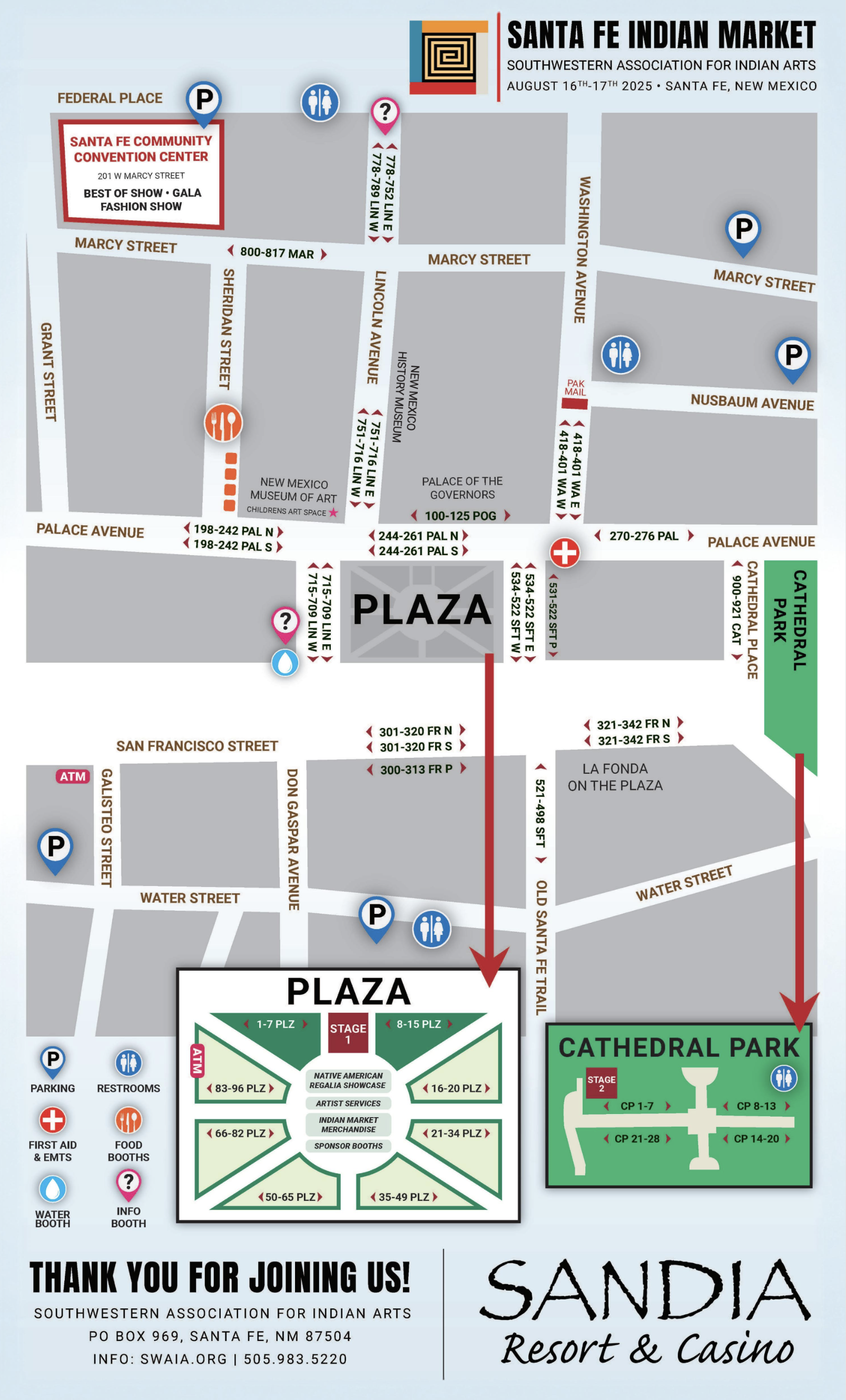 - SWAIA Santa Fe Indian Market: the original market, located downtown, near and on the plaza. Check out the plaza stage for various performances all weekend long. Also get a guide when you arrive to locate your favorite artists and plan your route. 8am-5pm