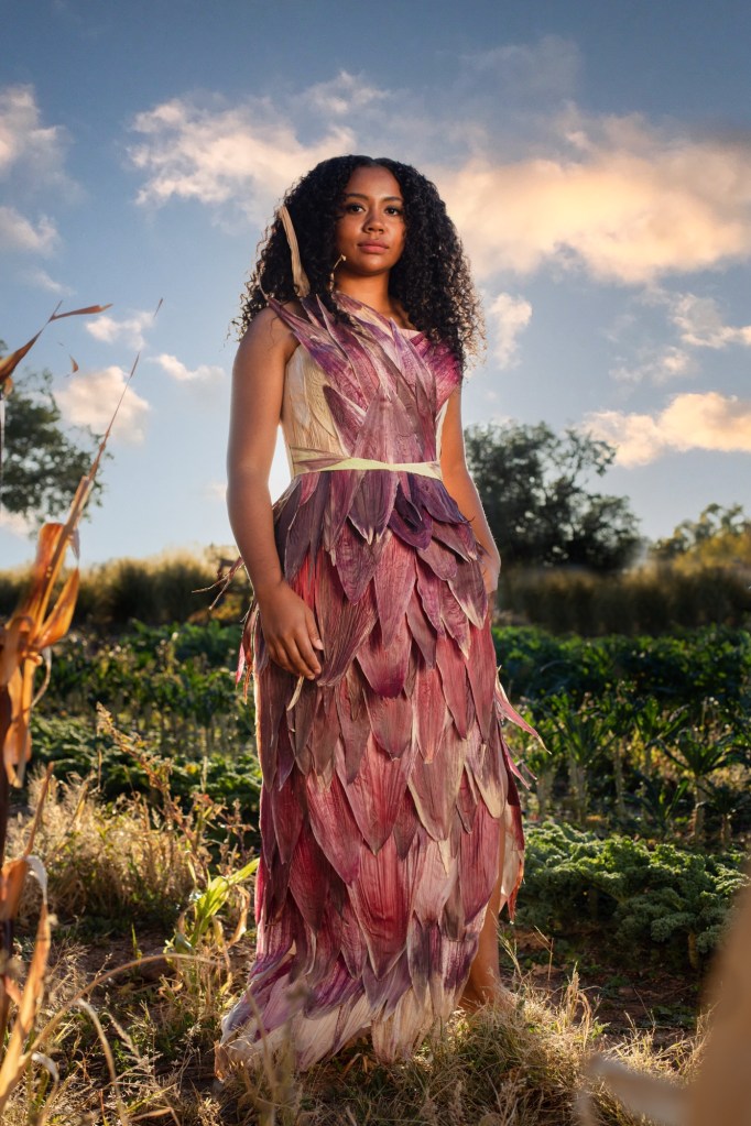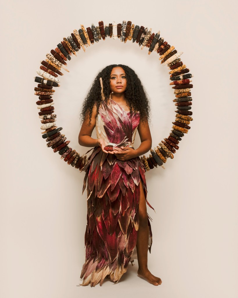 Dress made by Carrie Wood using corn husks grown and harvested by her and her family. The seeds come from her cheii’s corn, originally from the Dinébitó/Hard Rock area of Diné Bikeyah. The corn wreath made from the same corn.